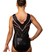 Leotard Adriana is made of black lycra mystique in combination with pink lycra mystique lines. Details with black mesh have been added to the chest and back. The mesh is lined.