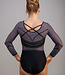 Leotard Charlie black is a stunning and elegant design made from matte lycra. The sections at the waist, the upper part of the leotard, and the sleeves are made of dark gray/black mesh. The sleeves feature stitched-on lines made from matte lycra. The lenght of the sleeves is 7/8. The front of the leotard has a V-neckline, while the back showcases crossed straps for an eye-catching look. It is beautifully decorated with KV Crystals in Crystal AB for extra sparkle.