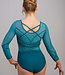 Leotard Charlie teal is a stunning and elegant design made from matte lycra. The sections at the waist, the upper part of the leotard, and the sleeves are made of green mesh. The sleeves feature stitched-on lines made from matte lycra. The lenght of the sleeves is 7/8. The front of the leotard has a V-neckline, while the back showcases crossed straps for an eye-catching look. It is beautifully decorated with KV Crystals in Crystal AB for extra sparkle.