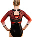 Turnpakje Eclipse is een bijzonder turnpakje gemaakt van verschillende soorten stoffen. De onderkant van het turnpakje is gemaakt van lycra mystique. De stukken bij de taille, het bovenstuk van het turnpakje én de mouwen zijn gemaakt van mesh. De lengte van de mouwen is 3/4. Het turnpakje heeft aan de voorkant een V-hals. De achterzijde van het turnpakje heeft een hoge hals met sluiting. Daarnaast zitten er KV Crystals op dit turnpakje in de kleuren Crystal AB en rood. Heb je vragen over dit ontwerp? Bel of mail gerust!